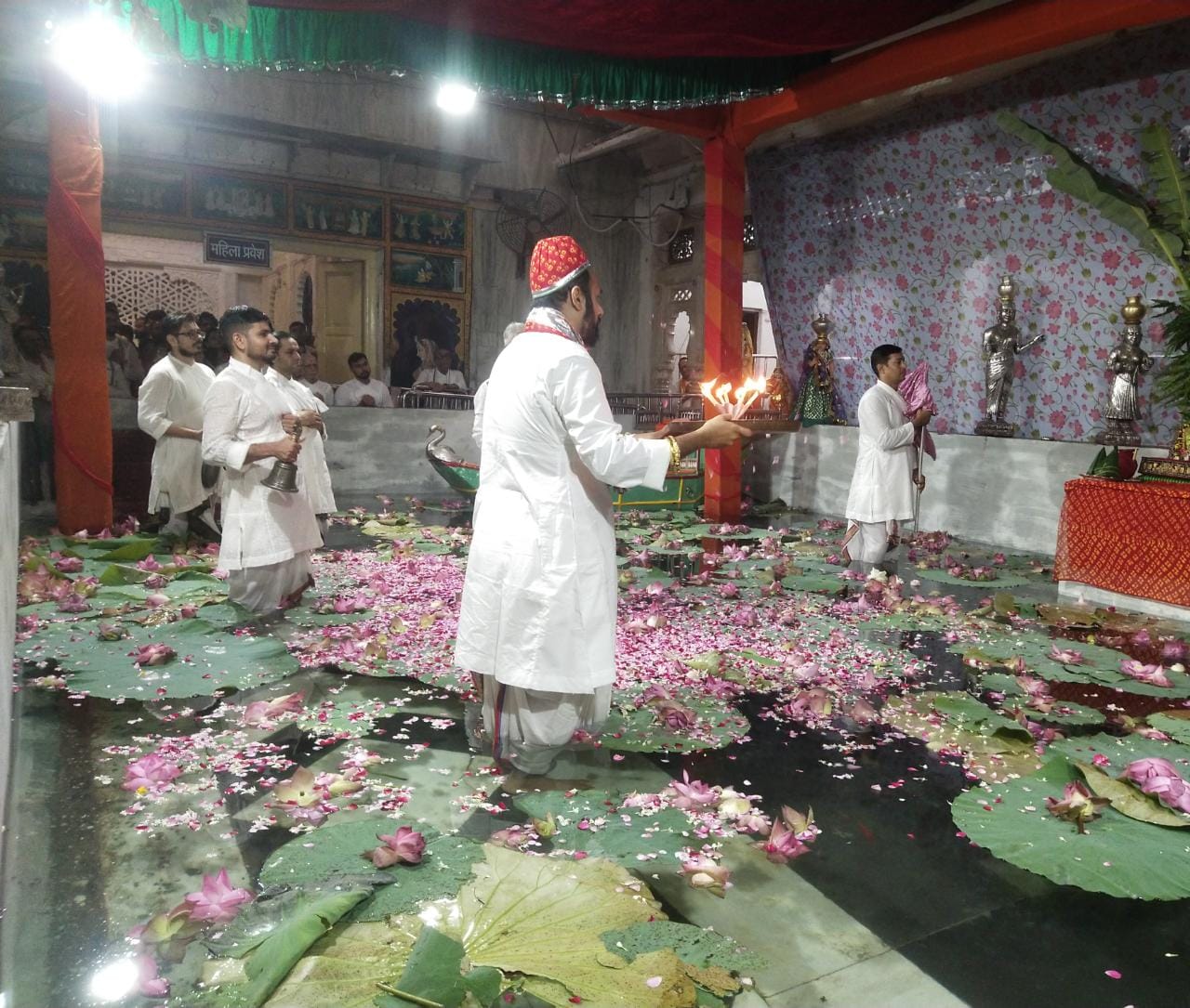 भोग आरती दर्शन में श्री प्रभु के मनोरथ में श्रीजी प्रभु श्री मदन मोहन प्रभु के रूप में डोल तिवारी में हिंडोरा में झूलकर कमल चौक में यमुना जी में नौका विहार की छटा में सखियों संग रसिक भाव से “कमल तलाई” की साज सज्जा के मध्य नाव में बिराजे एवं श्री लाडले लाल प्रभु निज मंदिर मे हिंडोलना में झूलकर तत्पश्चात कमल चौक में रसिक भाव से कमल तलाई में रसिक प्रिय संग के भाव से यमुना जी के मध्य कमल तलाई की छतरी में “कमल तलाई” के मनोरथ में विराजे पुष्टिमार्गीय प्रधान पीठ प्रभु श्रीनाथजी की हवेली में गो.ति.श्री 108 श्री इंद्रदमन जी श्री राकेश जी महाराज श्री की आज्ञा एवं गो.ची.श्री 105 श्री विशाल जी श्री भूपेश कुमार जी बावा श्री की प्रेरणा से हो रहे अधिक मास के मनोरथ मेंआज ,अधिक श्रावण कृष्ण बारस को प्रभु के अधिक मास के मनोरथ में श्रीजी प्रभु में राजभोग के दर्शन में श्री प्रभु को लाल पीली चुंदड़ी का पिछोड़ा के रूप का वस्त्र एवं श्री मस्तक पर गोल पाग पर ग्वाल पगा पर मोर चंद्रिका का श्रृंगार धरा कर एवं चीर हरण की पिछवाई चीरहरण के भाव के प्रतिनिधि की श्रीजी प्रभु को रसिक भाव से यमुना तट एवं गिरीराज जी की अद्भुत छटा के मध्य रसिक भाव से “चीरहरण” के मनोरथ में विराजित किया गया तथा भोग आरती दर्शन में डोल तिवारी में श्री मदन मोहन लाल प्रभु को श्रीजी प्रभु के स्वरुप में श्रावण माह के झूले के भाव से अधिक श्रावण के मनोरथ में हींडोरा में झूला कर तत्पश्चात कमल चौक में आनंद एवं रसिक प्रिय के भाव से श्रावण मास के मनोरथ में श्रावण माह की हरियाली की अद्भुत शोभा के मध्य नौका विहार के भाव से में गहरी यमुना में कमल एवं रंग-बिरंगे फूलों से सुसज्जित तलाई में “कमल तलाई” के मनोरथ में नाव में सखियों संग संपूर्ण साज सज्जा में बिराजित किया गया।