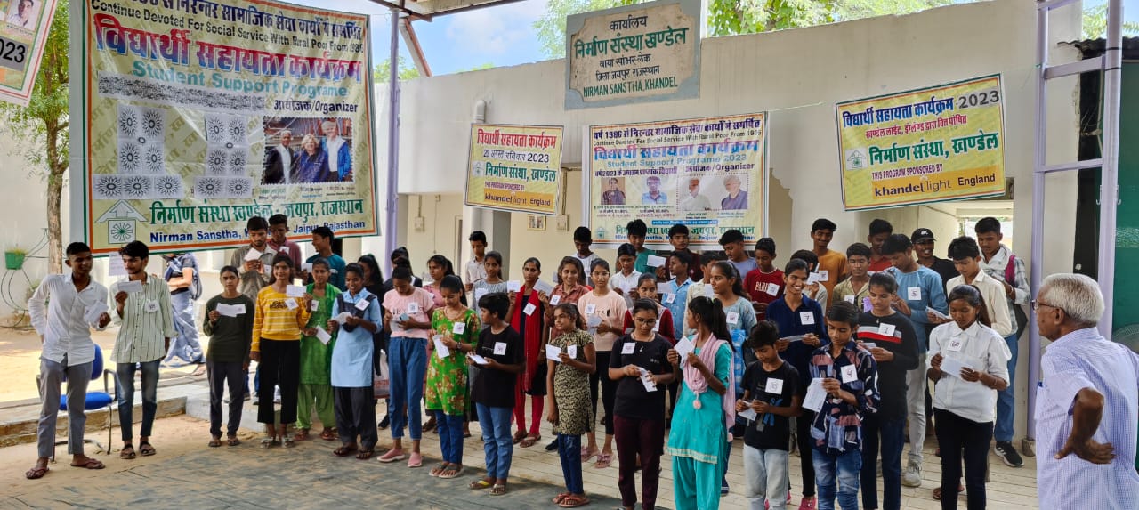 फुलेरा (दामोदर कुमावत) समीपवर्ती ग्राम खंडेल की निर्माण संस्था खण्डेल की ओर से गरीब, असहाय,व जरूरतमंद105 विद्यार्थियों को 2लाख75 हजार रूपये की नकद राशि वितरण की गई,संस्था निदेशक रामेश्वर लाल वर्मा ने बताया कि विगत 17 वर्षों से निर्माण संस्था खंडेल द्वारा समाज के गरीब,असहाय विद्यार्थी जिनके माता या पिता नहीं है