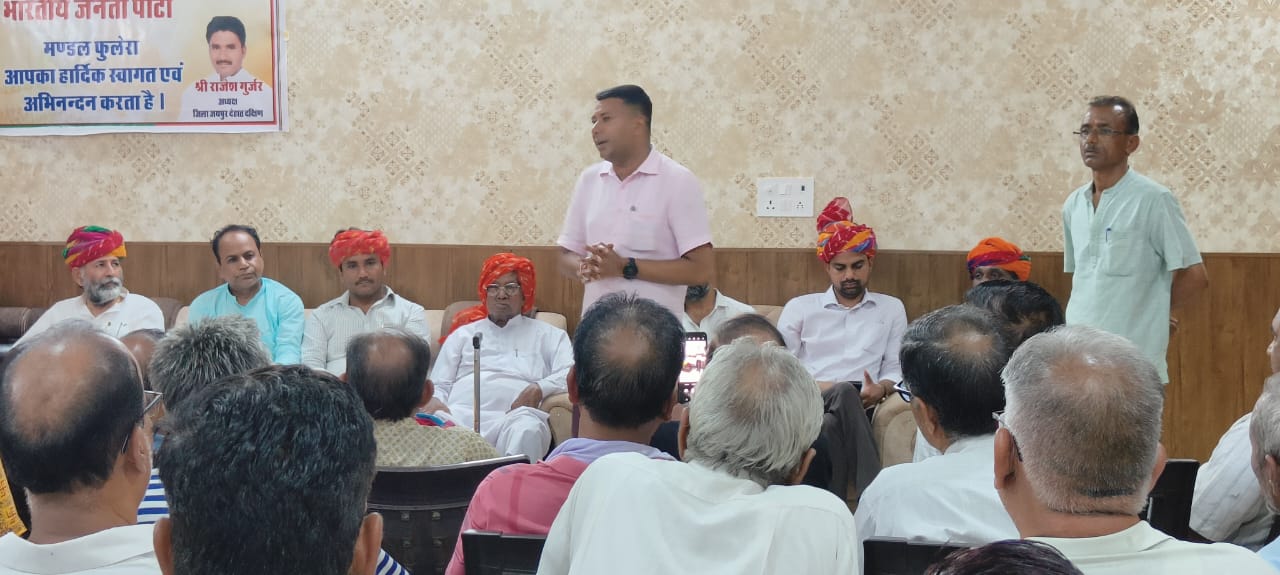 वही संभाग के सह प्रभारी सत्यनारायण चौधरी का भी माला व सफा पहनाकर स्वागत किया गया। कार्यक्रम की अध्यक्षता करते हुए फुलेरा विधायक निर्मल कुमावत ने भाजपा र्कार्यकर्ताओं का आह्वान करते हुए अनुशासनपूर्ण रीति नीति पर चलते हुए हमें प्रदेश तथा फुलेरा विधानसभा में भाजपा का परचम पुनः लहरा कर प्रदेश को प्रगतिशील राज्य की श्रेणी में स्थापित करना है। इस अवसर पर जिलाध्यक्ष राजेश गुर्जर द्वारा सभी कार्यकर्ताओं से अपील करते हुए वर्तमान राजस्थान कांग्रेस की जन विरोधी सरकार को जड़ से उखाड़ने का आह्वान किया,