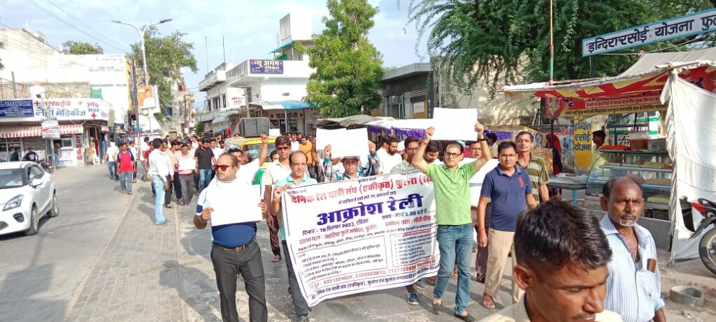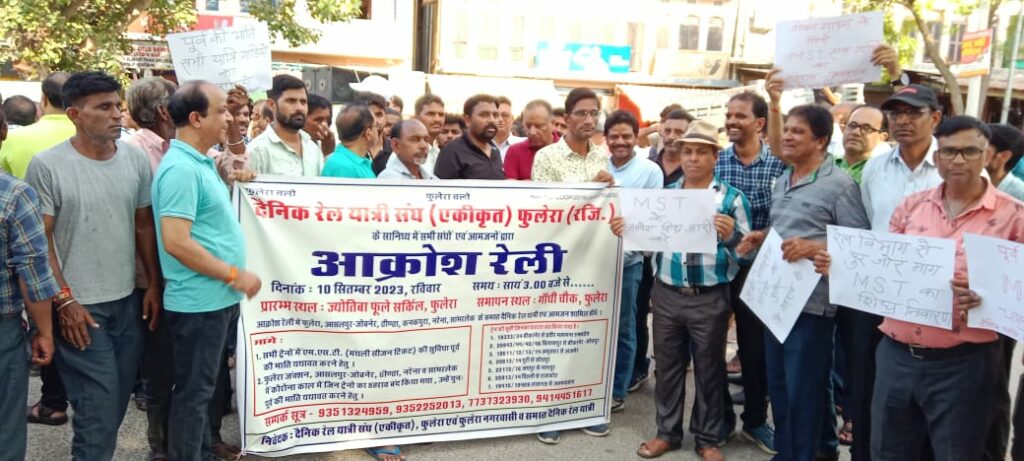 फुलेरा (दामोदर कुमावत) दैनिक रेल यात्री संघ एकीकृत अध्यक्ष अशोक वासदेव के नेतृत्व में रविवार को रेल संबंधित विभिन्न मांगों को लेकर कस्बे मे आक्रोश रैली का आयोजन किया गया।