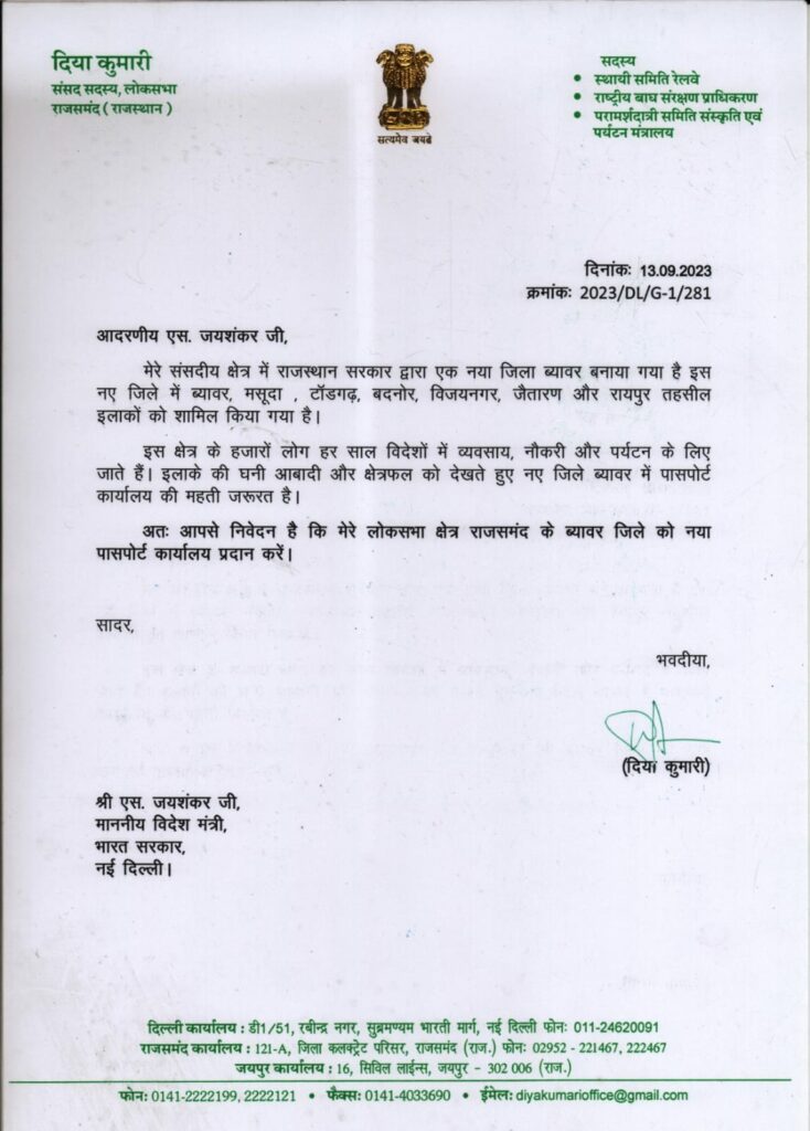 मेडतासिटी (तेजाराम लाडणवा) राजसमन्द सांसद श्रीमती दीया कुमारी ने केंद्रीय विदेश मंत्री श्री एस जयशंकर को पत्र लिखकर उनके संसदीय क्षेत्र में शामिल नये बने जिले ब्यावर में पासपोर्ट कार्यालय खोलने की मांग की है।