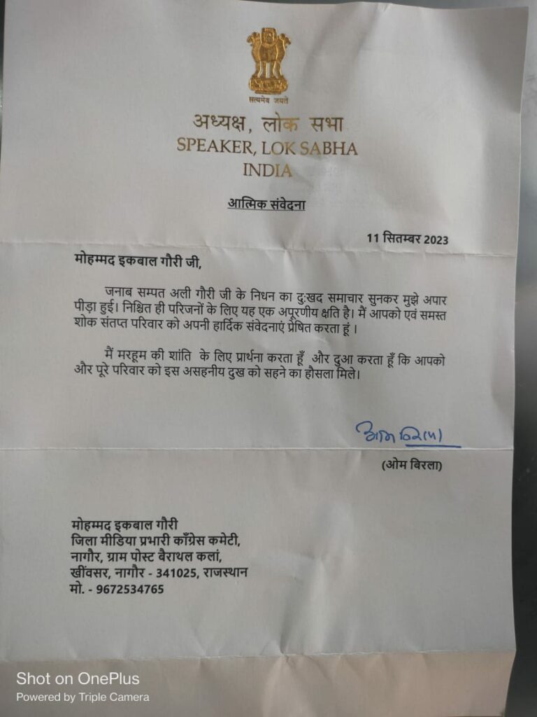 वही उनके निधन पर राजनीति की सभी पार्टियों के नेता परिजनों को ढाढस बनाने शोक सभा में पहुंचे। इसी कड़ी में सोमवार को लोकसभा अध्यक्ष ओम बिरला ने भी संवेदना पत्र इनके बेटे और नागौर कांग्रेस जिला मीडिया प्रभारी मोहम्मद इकबाल गोरी को पत्र लिखकर संवेदना प्रकट करते हुए लिखा कि स्वर्गीय सरपंच गोरी बेहतरीन समाजसेवी और गरीबों के दाता थे, उनकी कमी की भरपाई होना मुश्किल है,