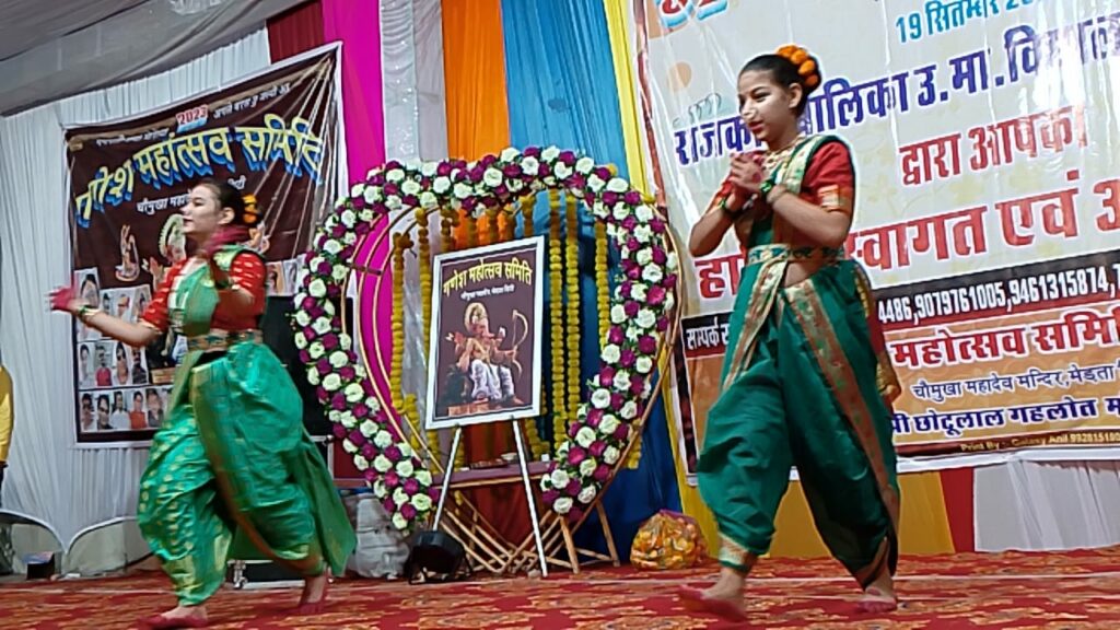 मेड़ता सिटी | शहर के जोधपुर रोड़ पर चौमुखा महादेव मंदिर परिसर में गणेश महोत्सव समिति के तत्वावधान में मंगलवार से शुरू हुए 10 दिवसीय गणेश महोत्सव के प्रथम दिन सांस्कृतिक कार्यक्रम का आयोजन हुआ। जिसमें राजकीय बालिका उच्च माध्यमिक विधालय की छात्राओं ने प्रस्तुतियां देकर उपस्थित दर्शकों का मन मोह लिया।