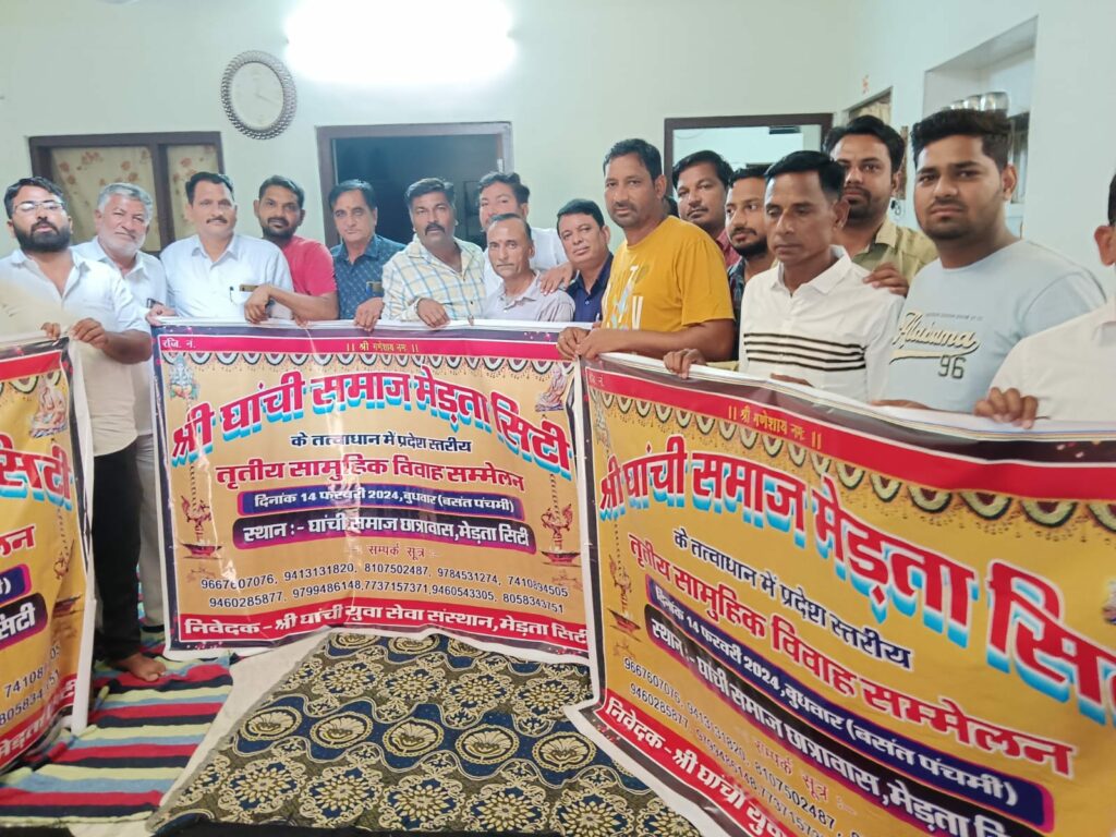 श्री घांची युवा सेवा संस्थान मेड़ता सिटी के तत्वाधान में तृतीय प्रदेश स्तरीय सामूहिक विवाह सम्मेलन 14 फरवरी 2024 को आयोजित करने के संबंध में समिति के पदाधिकारीकियगण ने आज खींवसर नागौर कुचेरा रेन में सामूहिक विवाह सम्मेलन का पोस्टर का विमोचन किया एवं सामूहिक विवाह सम्मेलन के संबंध में पेंपलेट वितरण किया तथा इस सम्मेलन में अधिक से अधिक जोड़ों का पंजीयन करवाने का आह्वान किया