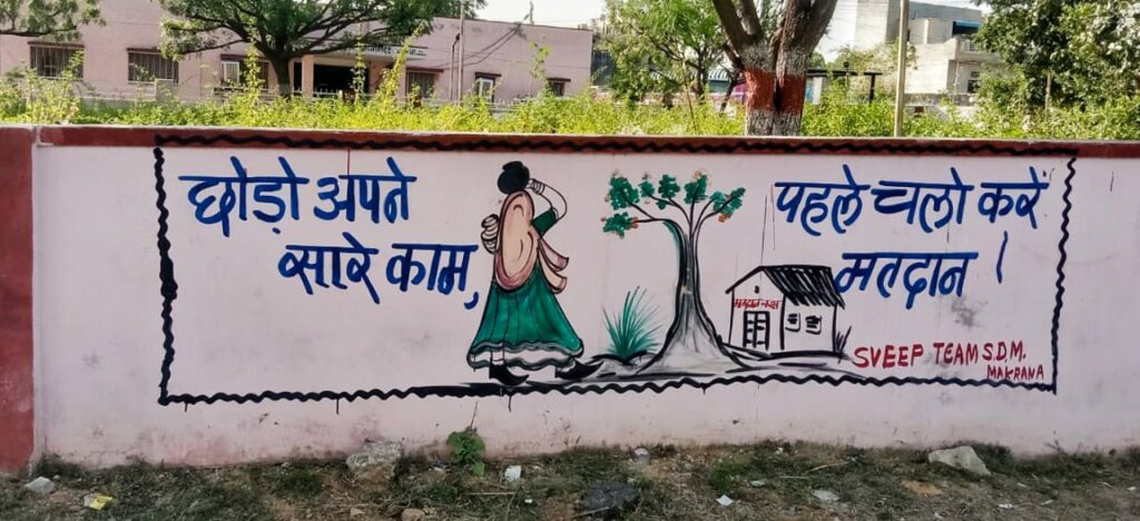 रविवार को स्वीप टीम के मेंबर मुरली मनोहर मेघवंशी के द्वारा शहरी क्षेत्र में लगभग 50 पॉइंट चिन्हित कर सार्वजनिक स्थानों पर स्थित दीवारों पर मतदान संबंधी स्लोगन लिखकर लोगों को प्रेरित करने का कार्य किया गया है। आगामी दिनों में ग्रामीण व शहरी क्षेत्र में