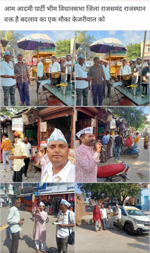 नाथद्वारा राजसमन्द जिले के भीम विधान सभा क्षेत्र के भीम देवगढ़ विधानसभा कमांडो मनोहर सिंह रावत द्वारा अपनी टीम के द्वारा भीम देवगढ़ विधानसभा क्षेत्र में अपने साथियों के द्वारा देश की दिल्ली, पंजाब में केजरी वाल जी की आम आदमी पार्टी की धमाके दार जीत के साथ आम आदमी को सहज भाव से साधन सुविधा व्यव्स्था उपल्ब्ध मे हो उसके लिए हर गली मोहल्लों बाजार गांव गांव ढाणी भागल में आम आदमी, को दिल्ली पंजाब की तरह राजस्थान मे भी आम आदमी को राहत दिलवाए जाने की बात करते हुवे सबको देखा बार-बार हमको देखो एक बार के वादे के साथ ही बताया जा रहा है