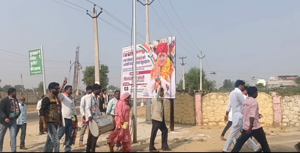 ढाणी कारीगरान माध्यमिक विद्यालय,अजमेरीगेट, शिव चौक होते हुए मालियों का मोहल्ला, सियाराम बाबा की बगीची, रामदेव जी का मंदिर, कलालिया होते हुए पुन:चुनाव कार्यालय पहुंचे इस दौरान कांग्रेस कार्य कर्ताओं ने घर-घर जाकर कांग्रेस प्रत्याशी विद्याधर सिंह चौधरी के पक्ष में 25 तारीख को कांग्रेस के चुनाव चिन्ह हाथ पर मोहर लगाने का आग्रह किया।