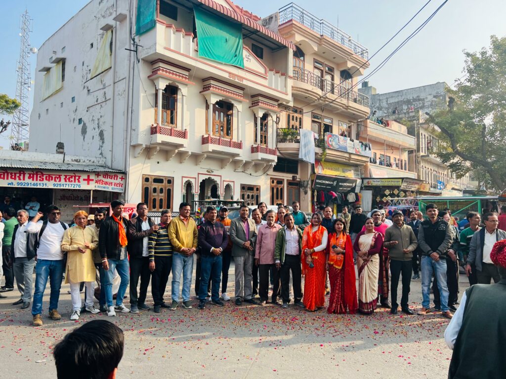नगर में जगह जगह पर धर्मप्रेमियों ने बड़े उत्साह के साथ भगवा शोभायात्रा पर पुष्प वर्षा कर उनका उत्साह वर्धन किया। शोभा यात्रा का समापन न्यू कॉलोनी स्थित श्री गणेश मंदिर पर हुआ। इससे पूर्व अयोध्या से लाए गए पीत अक्षत कुंभ ( पीले चावल ) का विधिवत रूप से पूजन पंडित कुंजबिहारी वशिष्ठ द्वारा संपन्न हुआ। जिसकी पूजा अर्चना श्रीमती पूनम व महेशकुमावत, अंकिता जैन,बीनाशर्मा, गीता शर्मा और अन्य महिलाओं द्वारा मंगल गीत गाकर की गई। अक्षत का नगर भ्रमण करवाया गया। चारो तरफ भगवा माहोल को देखकर सनातन प्रेमियों में एक अलग ही जोश नजर आया।