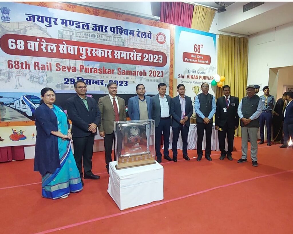 उत्तर पश्चिम रेलवे जयपुर मंडल पर 68वां रेल सेवा पुरस्कार समारोह शुक्रवार को’अरावलीक्लब, रेलवे कॉलोनी मे मनाया गया। जिसमें मंडल रेल प्रबंधक विकासपुरवार ने मां शारदे के आगे दीप प्रज्जवलित कर कार्यक्रम की शुरुआत की गई।