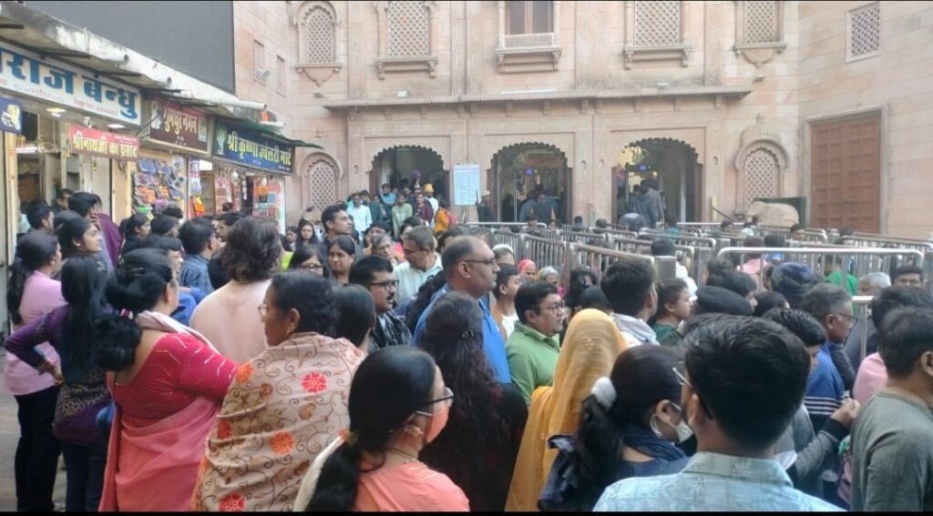 जिसके चलते दर्शनार्थियो वैष्णव जन को लक्ष्मी निवास गेट से होते हुए मीरा बाई मंदिर के बहार से लेकर नगार खाना गेट, गोर्वधन पूजा चोक, धोली पटिया, कमल चोक, अनार चोक होते हुए डोल तिवारी से निकाल ते हुए लालन प्रभू में दर्शन कर गेट नम्बर एक मोती महल परिसर से बाहर निकाल रहे हैं साथ ही मनोर्थियो, सेवा वालो को प्रीतम पोली गेट से प्रवेश करवाया जा कर राहत दिलाई जा रही है, इस अवसर पर सुरक्षा की दृष्टि को मध्य नज़र रखते हुए पुलिस प्रशासन द्वारा सुरक्षा के पुख्ता इंतजाम किए गए साथ ही नगर में आने वाले दर्शनार्थियो वैष्णव जन को पार्किंग सुविधा उपलब्ध कराने के लिए पार्किंग स्थल, रसाला चोक, गोविन्द चोक मोबे गड़, 120फीट रोड़ के साथ में पार्किंग सुविधा उपलब्ध कराई गई है जिसके चलते आम आदमी को सहज दर्शन उपलब्ध हों रहे हैं। बाजारों में आम दुकानदारों द्वारा आने वाले दर्शनार्थियो वैष्णव जन से । खाने पीने के सामान के मुंह मांगा दाम वसूला जा रहा है जबकि लोगो ने बड़े आक्रोश के साथ बताया कि मानक चौक दिल्ली बाजार अहिल्या कुण्ड व्यास का कुण्ड, फौज मोहल्ला स्थित दुकानदारो द्वारा घटिया सामग्री का उपयोग लिया जाता है और मन माना दाम वसूला जा रहा है लेकिन संबंधित विभाग को स्थानीय जागरुक लोगो गणमान्य नागरिक सहित राजनीतिक दलों के स्थनीय प्धाधिकारियो द्वारा अवगत कराने के उपरान्त भी नतीजा ढाक के तीन पात रहा ऑटो रिक्शा चालको द्वारा निर्धारित न्यूनतम किराया को दर किनार करते हुए वैष्णव जन धर्सनार्थीयो, सहित लोगो से मन माना वसूला जा रहा है। संबंधित विभाग व प्रशासन जानते हुवे भी अनजान बने हुए हैं।