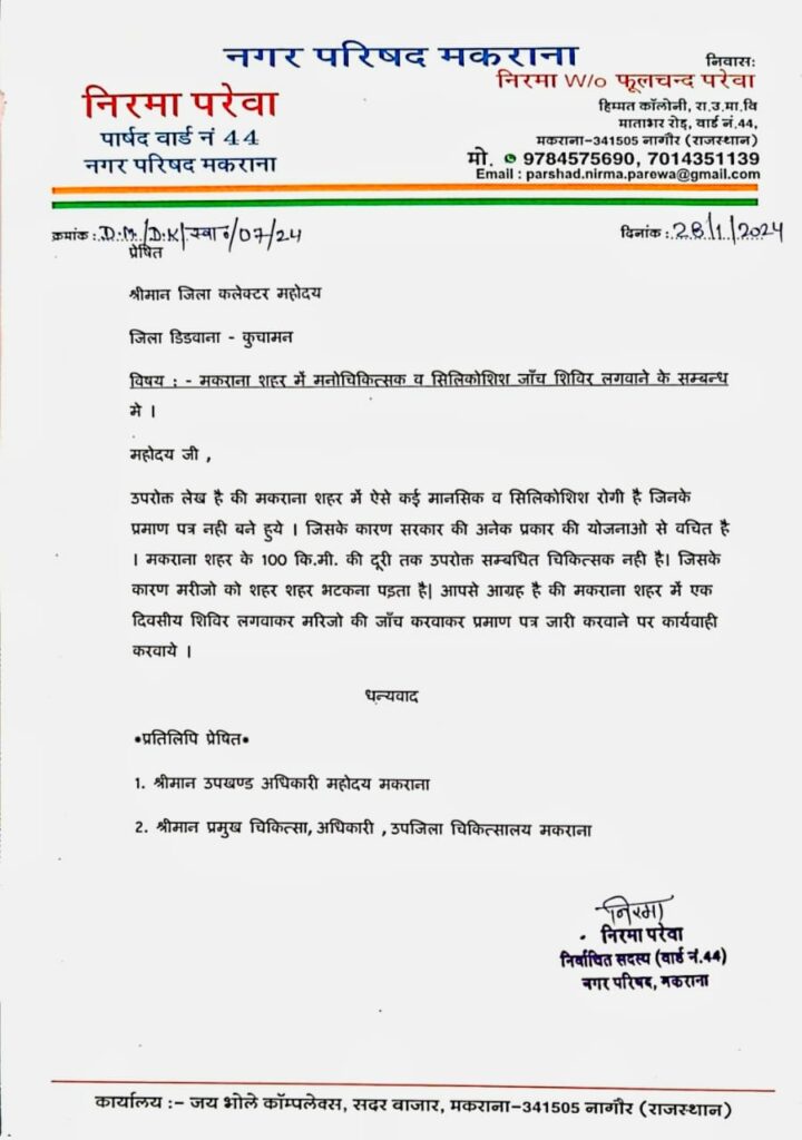 मकराना (मोहम्मद शहजाद)। मकराना नगर परिषद वार्ड 44 की पार्षद निरमा फूलचन्द परेवा ने डिडवाना – कुचामन कलेक्टर मुकुन्द असावा को पत्र प्रेषित कर मानसिक व सिलिकोसीस रोगी हेतु शिविर लगवाने की मांग की है। परेवा ने बताया की मकराना शहर में ऐसे कई मानसिक व सिलिकोसिस पीड़ित है जिसके प्रमाण पत्र नही बने।