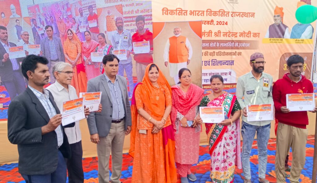 वीडियो कांफ्रेंस के जरिए अपने संबोधन में प्रधानमंत्री कांग्रेस पर निशाना साधने से भी नहीं चूके। उन्होंने भाषण में कांग्रेस पर जमकर बयानी वार किए। उन्होंने कहा कांग्रेस के साथ एक बहुत बड़ी समस्या ये है कि वो दूरगामी सोच के साथ सकारात्मक नीतियां नहीं बना सकती। कांग्रेस न भविष्य को भांप सकती है और न ही भविष्य के लिए उसके पास कोई रोड मैप है। कांग्रेस की इसी सोच के कारण भारत अपनी बिजली व्यवस्था को लेकर बदनाम रहता था। कांग्रेस के दौरान बिजली की कमी के कारण पूरे देश में कई-कई घंटों तक अंधेरा हो जाता था। करोड़ों घरों में बिजली कनेक्शन ही नहीं था। बिजली के अभाव में कोई भी देश विकसित नहीं हो सकता। कांग्रेस जिस रफ्तार से इस चुनौती पर काम कर रही थी, उससे बिजली समस्या ठीक होने में कई दशक लग जाते। उन्होंने कहा सोलर से आज हर ग्राम शहर में बिजली की आपूर्ति की जा रही है। पीएम सूर्य घर के तहत सरकार 300 यूनिट तक मुफ्त बिजली की व्यवस्था करेगी। सोलर पैनल लगाने के लिए सस्ता और आसान ऋण दिया जायेगा। डबल इंजन सरकार गरीब और माध्यम वर्ग को आगे लाने के लिए जुटी है। पिछली सरकार के पेपर लीक के लिए जांच के लिए एसआईटी बना दी गई है, पेपर लीक करने वालों के खिलाफ केंद्र ने कड़ा कानून बनाया है जिससे पेपर लीक करने वाला माफिया कई बार सोचेगा। संबोधन के अंत में उन्होंने कहा विकसित भारत बनाने के लिए हम देश के 4 वर्गों को मजबूत बनाने में जुटे हैं। ये वर्ग हैं- युवा, महिला, किसान और गरीब। हमारे लिए यही 4 सबसे बड़ी जातियां हैं। कार्यक्रम के अंत में विभिन्न योजनाओं के लाभार्थियों को गारंटी कार्ड और योजनाओं का लाभ दिया गया। कार्यक्रम में विभिन्न विद्यालयों से आए विद्यार्थियों ने सांस्कृतिक कार्यक्रम प्रस्तुत किए। इस मौके पर मकराना उपखंड अधिकारी जेपी बैरवा, नगर परिषद आयुक्त सीता वर्मा, ब्लॉक शिक्षा अधिकारी दीपक कुमार शुक्ला, पंचायत समिति की प्रधान सुमिता भींचर, भाजपा शहर मंडल अध्यक्ष घनश्याम सोनी सहित शहरी व ग्रामीण क्षेत्र से आए हजारों लोग उपस्थित थे।