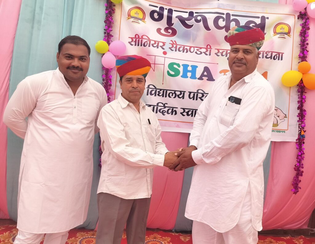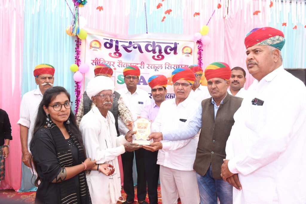 फोटो-गुरुकुल सिराधना प्रांगण में पूर्व विधार्थियों व भामाशाहों का अभिनंदन करता शाला परिवार ।