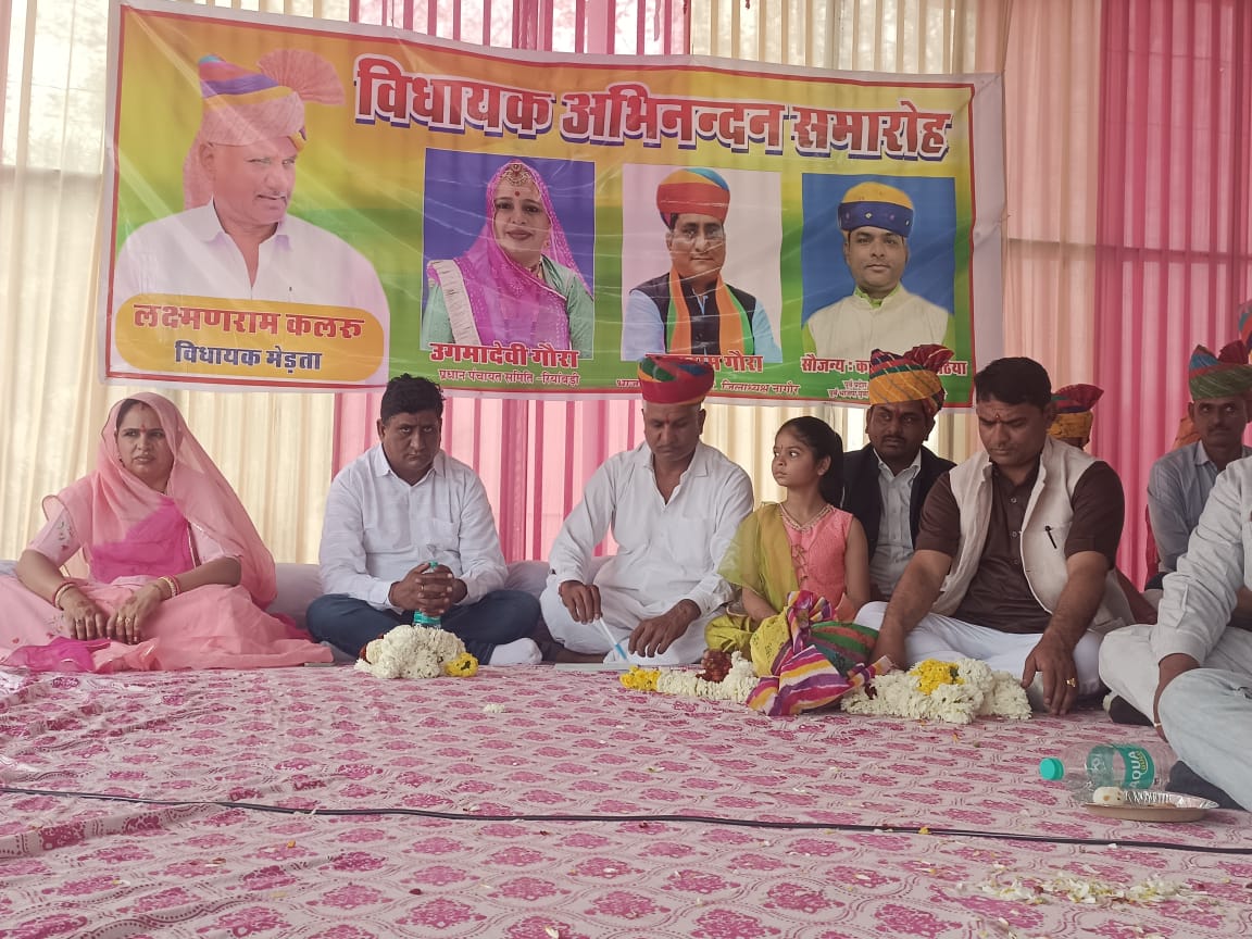 रिया बड़ी उपखंड मुख्यालय के पंचायत समिति परिसर में विधायक व भामाशाह सम्मान समारोह का आयोजन हुआ भामाशाह सम्मान समारोह के मुख्य अतिथि मेड़ता विधायक लक्ष्मण कलरु का भामाशाह कानाराम मारोठिया ने 31 किलो की पुष्प माला पहनाकर सम्मान किया मेड़ता विधायक व रिया बड़ी प्रधान उगमा देवी गोरा द्वारा शव संरक्षण बॉक्स का समारोह पूर्वक फिता काटकर लोकार्पण किया।