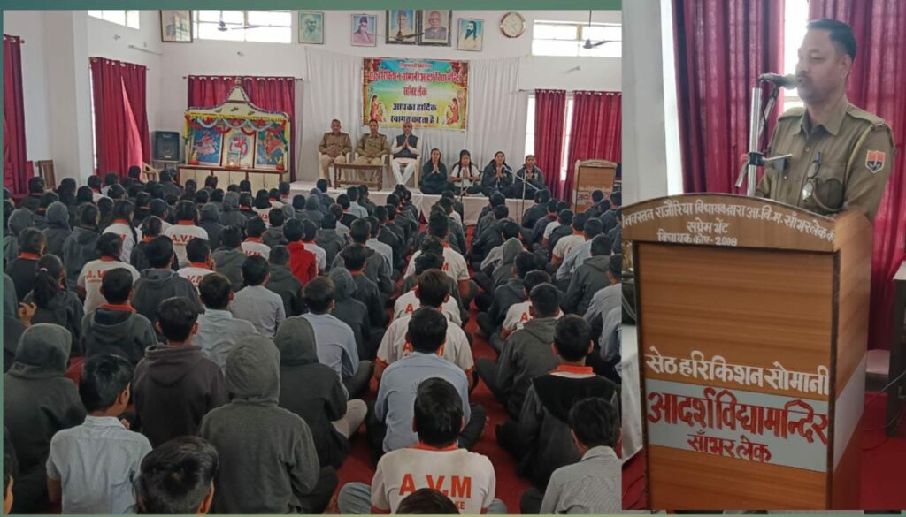 सांभर कस्बे के नीम रोड स्थित सेठ हरि किशन सोमानी आदर्श विद्या मंदिर में सांभर थाना पुलिस के हैड कांस्टेबल रमेश चन्द ने छात्र छात्राओं को बुधवार को यातायात नियमों की जानकारी प्रदान की। हैड कांस्टेबल रमेश चन्द ने कहा की दुपहिया वाहन चलाते समय सभी को हेलमेट और चौपहिया वाहन चलाते समय सभी को सीट बेल्ट का प्रयोग करना चाहिए और बिना ड्राइविंग लाइसेंस के वाहन नहीं चलाना चाहिए |