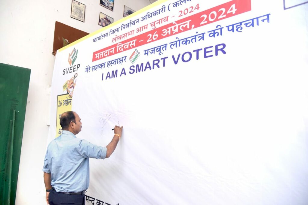 नाथद्वारा राजसमंद जिला मुख्यालय पर आज जिला निर्वाचन अधिकारी (कलक्टर) डॉ. भंवर लाल ने सोमवार को स्वीप कार्यक्रम के तहत जिला कलेक्ट्रेट में लगाई गई मतदाता जागरूकता वॉल पर अपने हस्ताक्षर कर हस्ताक्षर अभियान की शुरुआत की।