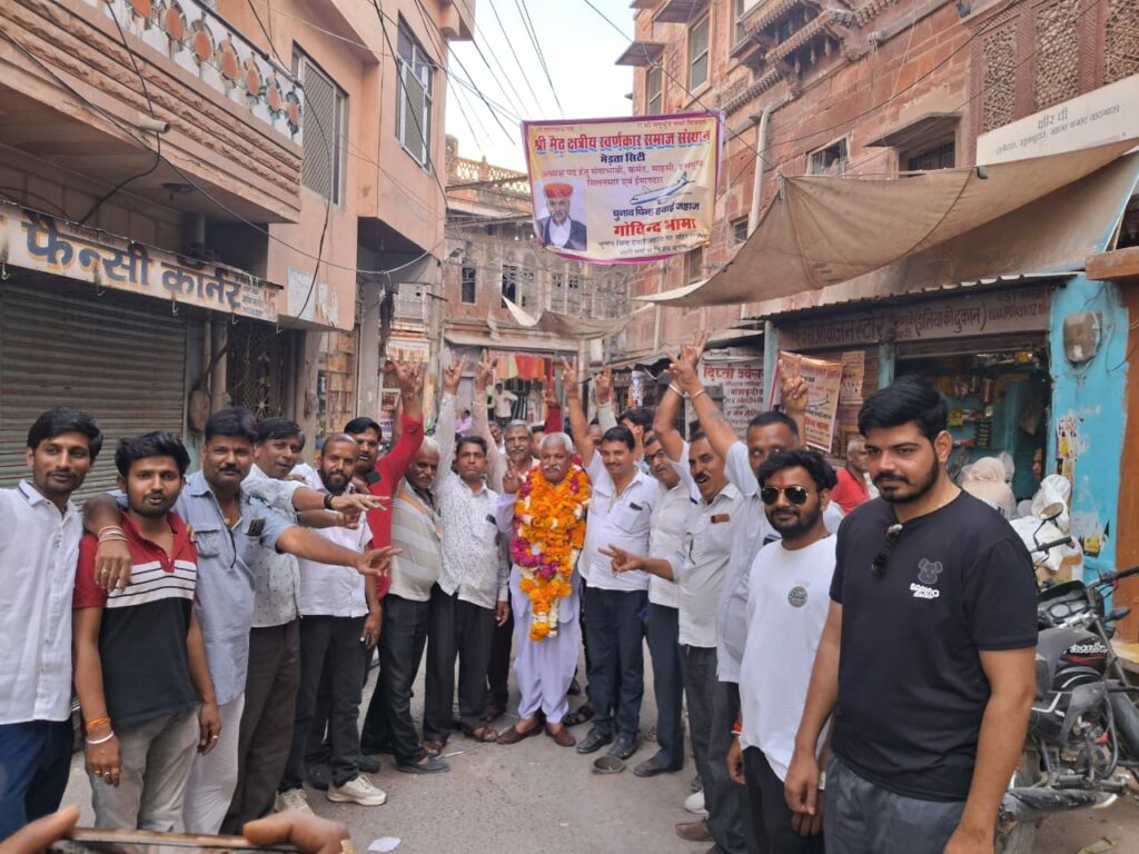 मेड़ता स्वर्णकार समाज के अध्यक्ष पद उम्मीदवार गोविंद भामा आज अपने समर्थकों के साथ मेड़ता क्षेत्र में संपर्क करने के दौरान स्वर्णकार समाज बंधुओं द्वारा जगह जगह माला पहनाकर स्वागत किया गया।