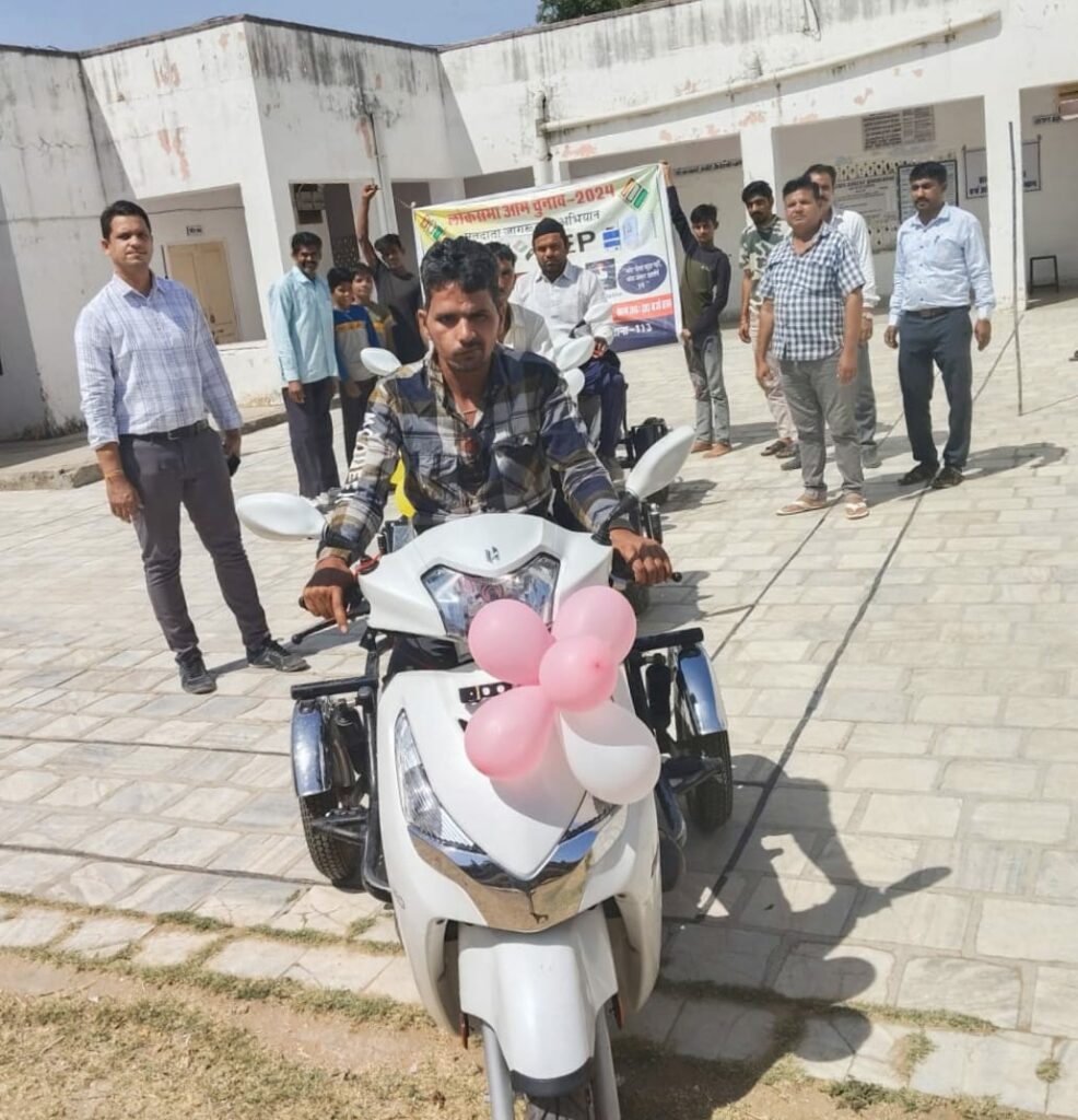इस दौरान सामाजिक न्याय एवं अधिकारिता विभाग के अधिकारी जयप्रकाश जांगिड़, स्वीप टीम प्रभारी डॉक्टर जगदीश प्रसाद चोयल, सदस्य मुरली मनोहर मेघ, महेश कुमार ने दिव्यांगजनों को संबोधित करते हुए लोकतंत्र को मजबूत बनाने शत प्रतिशत मतदान करने की अपील की। इसके पश्चात दिव्यांग मतदाताओं ने स्कूटी पर मतदाता जागरूकता रैली निकाली और दिव्यांगनों को मतदान करने हेतु प्रेरित किया। इस अवसर पर सामाजिक न्याय एवं अधिकारिता विभाग के अमित खाण्डल, वार्डन भरत सिंह सहित दिव्यांग मतदाता उपस्थित थे।