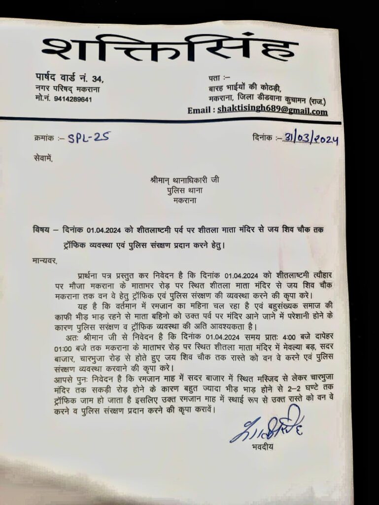 मकराना (मोहम्मद शहजाद)। नगर परिषद मकराना के वार्ड 34 के पार्षद शक्तिसिंह चौहान ने रविवार को मकराना थानाधिकारी को पत्र प्रेषित कर शीतलाष्टमी के दिन यानी 1 अप्रैल 2024 को ट्रैफिक व्यवस्था वन वे करने की मांग की है।
