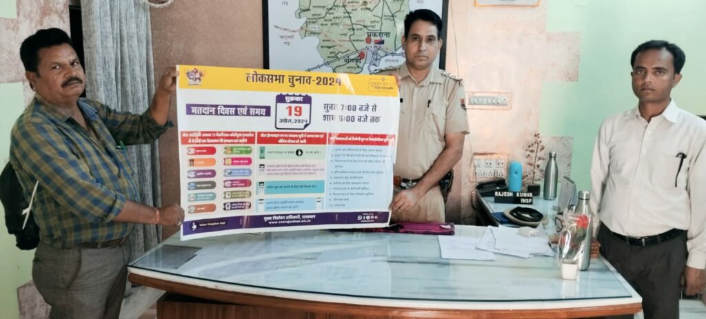 मकराना (मोहम्मद शहजाद)। सहायक निर्वाचन अधिकारी सुनील कुमार के आदेशानुसार स्वीप टीम द्वारा मकराना शहर सहित ग्रामीण क्षेत्रों में लोकसभा चुनाव के मद्देनजर आमजन को विभिन्न गतिविधियों द्वारा जागरूक किया जा रहा है। इसी क्रम में शुक्रवार को पुलिस उपाधीक्षक कार्यालय, पुलिस थाना मकराना सहित अन्य सार्वजनिक स्थानों और सरकारी कार्यालयों पर जन जागृति पोस्टर के माध्यम से आमजन को मतदान की अपील की गई।