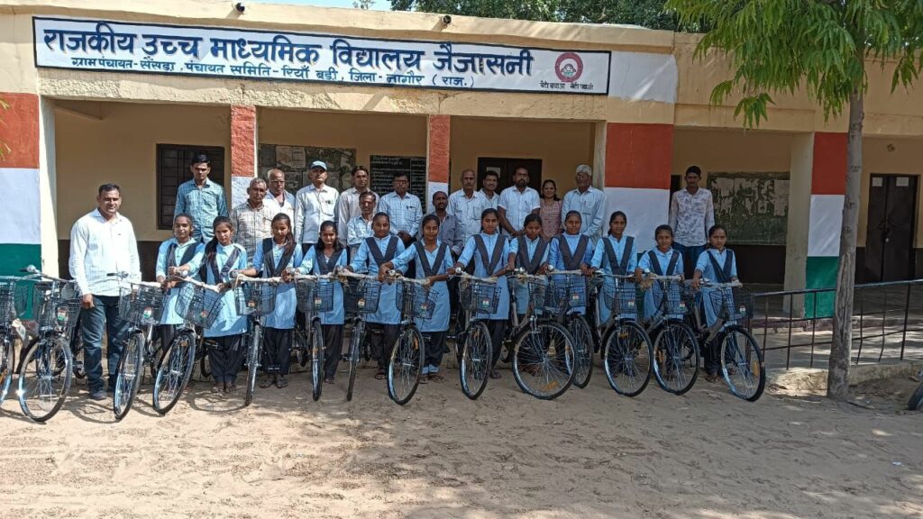 (राकेश सैन) सेंसडा। ग्राम पंचायत सेंसडा के ग्राम जैजासनी के राजकीय उच्च माध्यमिक विद्यालय जैजासनी में कक्षा 9 व 10 के नियमित अध्यनरत छात्राओं को साइकिल वितरण कार्यक्रम आयोजित किया गया। संस्था प्रधान चेनाराम बेरवाल ने बताया कि कक्षा 9 व 10 मे बालिकाओं को दो सत्रो की साइकिल निशुल्क राज्य सरकार द्वारा दीगई उनका वितरण किया।