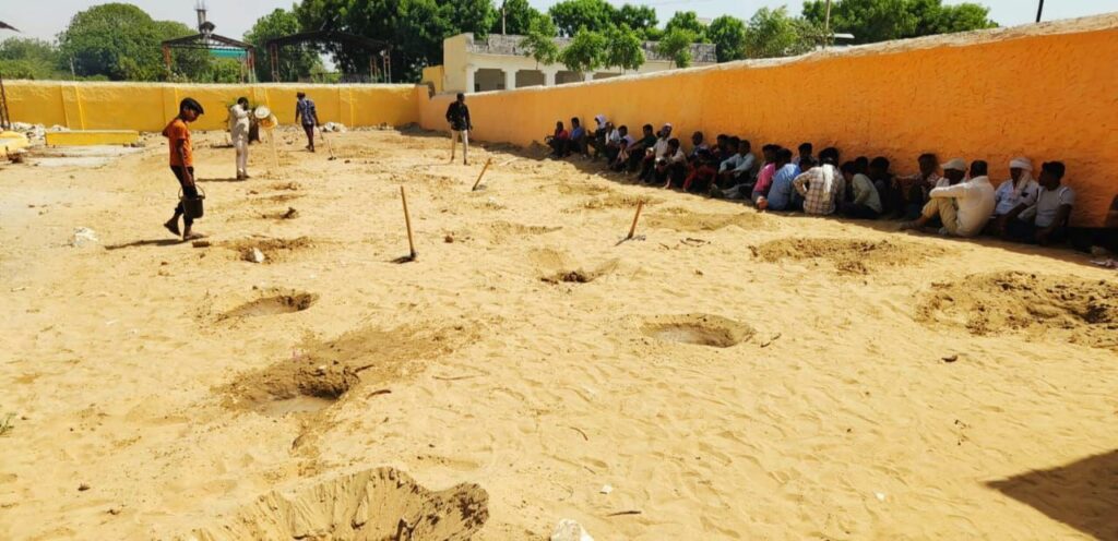 मकराना (मोहम्मद शहजाद )। शहर के कर्बला चौक के पास स्थित बन्जारा समाज मोक्ष धाम में वार्ड न. 44 निवासी बंशी लाल बन्जारा का निधन हो गया। जिनका अन्तिम संस्कार हेतु सभी बन्धु मोक्ष धाम पहुँचे। शव यात्रा में सम्मिलित पार्षद प्रतिनिधि फूलचन्द परेवा की प्रेरणा से मात्र 30 मिनट में 50 से अधिक गढ्ढे खोदकर उनमें पानी दिया गया।