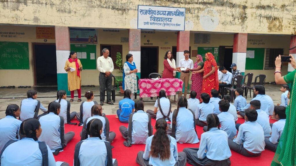 इस अवसर पर ढाणी कारीगरान विद्यालय की प्राचार्या श्रीमती सुनीता शर्मा ने प्रार्थना सभा में ट्रस्ट द्वारा प्रदत्त चैक बालको को प्रदान कर उन्हें आगे बढ़ने तथा जीवन में उत्तरोत्तर प्रगति करने के साथ इनके उज्जवल भविष्य की कामना करते हुए आशीर्वाद प्रदान किया।