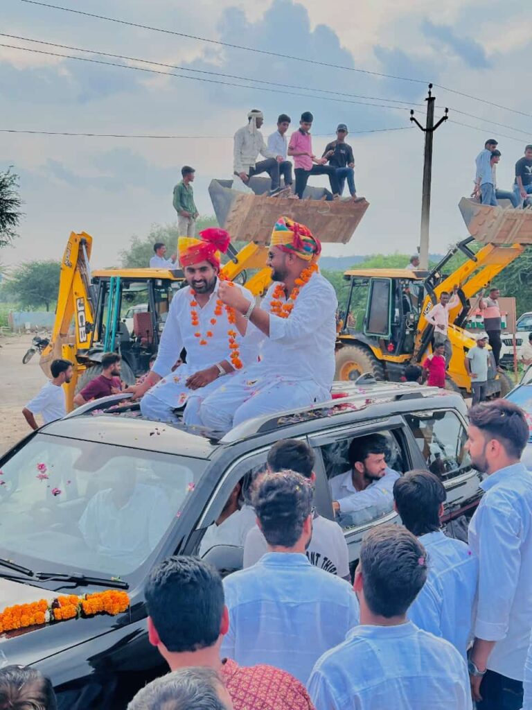 इसी क्रम में मानवता पंचकर्मा एवं आयुर्वेदा हॉस्पिटल के नोरत गोदारा, युवा नेता अभिषेक भींचर, रामचंद्र मूंड , हरि , किशोर सिंह, मनोज चौधरी द्वारा जे सी बी द्वारा पुष्पवर्षा कर श्रीवीर तेजा संघ का स्वागत किया गया।