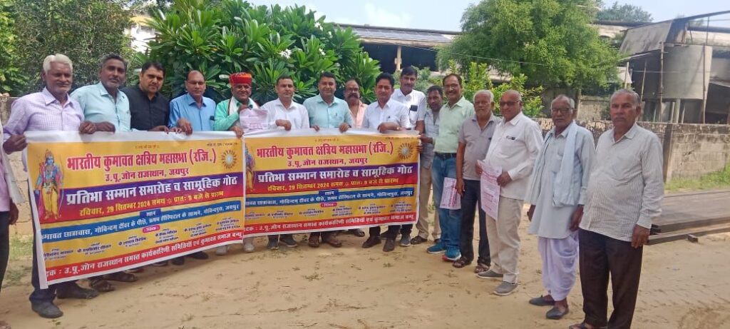 फुलेरा (दामोदर कुमावत) भारतीय कुमावत क्षत्रिय महासभा (रजि.) उत्तरी- पूर्वी जोन राजस्थान के तत्वाधान में 29 सितंबर 2024 रविवार को प्रतिभा सम्मानसमारोह वसामूहिक गोठ का आयोजन किया जा रहा है।