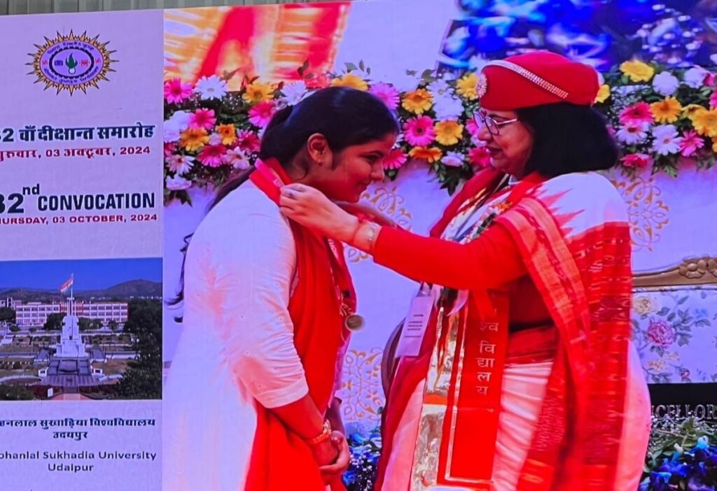 नाथद्वारा उपली ओडन स्थित श्रीनाथजी इंस्टिट्यूट ऑफ़ बायोटेक्नोलॉजी एंड मैनेजमेंट में बीबीए की छात्रा छवि धूपिया पुत्री प्रवीण धूपिया को मोहनलाल सुखाड़िया विश्वविद्यालय उदयपुर द्वारा दीक्षांत समारोह में स्वर्ण पदक दिया गया।