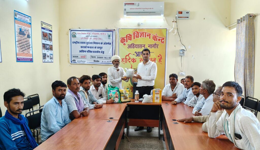 जिसमें नागौर जिले के लिए उपयुक्त उन्नत किस्म डीआरएमआर 1165-40 सरसों को 25 किसानों के खेत पर प्रदर्शन के लिए लगाए जाएंगे। इस कार्यक्रम के नोडल अधिकारी डॉक्टर हरिराम चौधरी ने आगे बताया कि ग्राम खाबड़ियाना तहसील जायल के किसानों को इस किस्म के साथ-साथ मृर्दा एवं बीज उपचार में पोषक तत्वों के लिए सल्फर जिंक तथा कीटों के प्रबंधन के लिए एसिटामाइडप्रीड़ दवाइयां की जानकारी विस्तार से देकर वितरण किया गया।