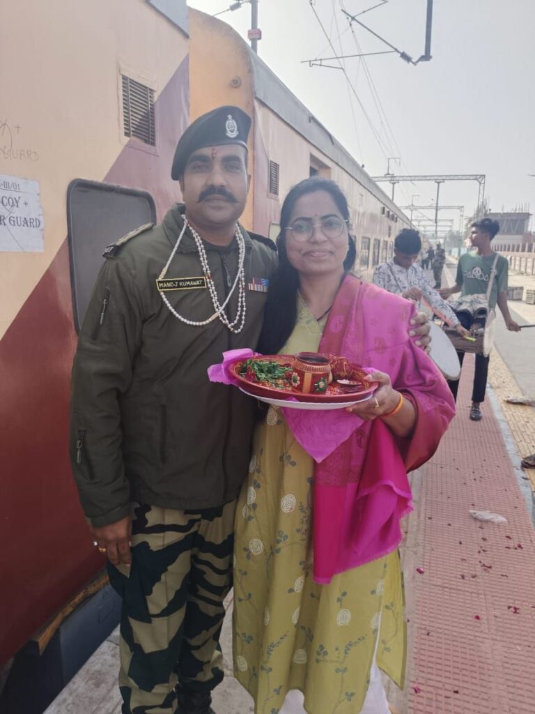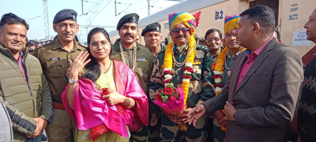 जो रविवार को बीएसएफ की स्पेशल रेल से 108 वीं बटालियन जैसलमेर से त्रिपुरा जाते समय फुलेरा रेलवे स्टेशन पर एसीएमओ डॉ मनोज कुमावत के परिवारजन, राजनेता, व्यापारियों व सामाजिक संगठनों द्वारा ट्रेन से पहुंची बटालियन के कमांडेंट अनु टीपी एवं एसीएमओ डॉ मनोज कुमावत तथा अधिकारियों का पूर्व विधायक निर्मल कुमावत, भाजपा अध्यक्ष प्रणव कयाल पूर्व पालिका अध्यक्ष रतन राजोरा तथा डॉ मनोज कुमावत की दादीजी श्रीमतीभंवरी देवी,