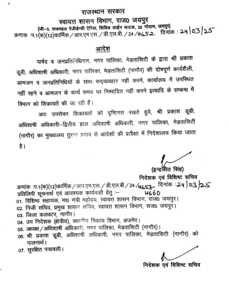 राजस्थान सरकार के स्वायत्त शासन विभाग ने एक आदेश जारी किया है, जिसमें अधिशाषी अधिकारी प्रकाश डूडी को उनके पद से हटा दिया गया है। यह आदेश उनकी दोषपूर्ण कार्यशैली और आमजन व जनप्रतिनिधियों के साथ सद्व्यवहार नहीं करने के कारण लिया गया है।