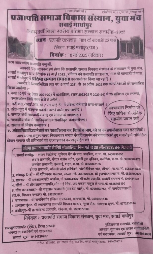 प्रजापति समाज विकास संस्थान, युवा मंच सवाई माधोपुर द्वारा 18 मई 2025 को प्रजापति छात्रावास, माल के बालाजी के पास, सवाई माधोपुर में प्रतिभा सम्मान समारोह का आयोजन किया जा रहा है। इस समारोह में विभिन्न क्षेत्रों में उत्कृष्ट प्रदर्शन करने वाले प्रतिभाशाली छात्रों को सम्मानित किया जाएगा।