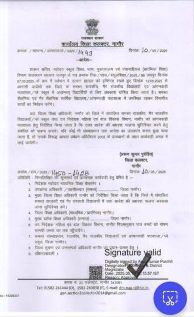 नागौर जिले में वर्तमान हालात को देखते हुए, शासन सचिव के आदेशानुसार, दिनांक 12 मई से आगामी आदेशों तक जिले के सभी राजकीय, गैर राजकीय विद्यालयों और आंगनवाड़ी पाठशालाओं में अवकाश घोषित किया गया है।