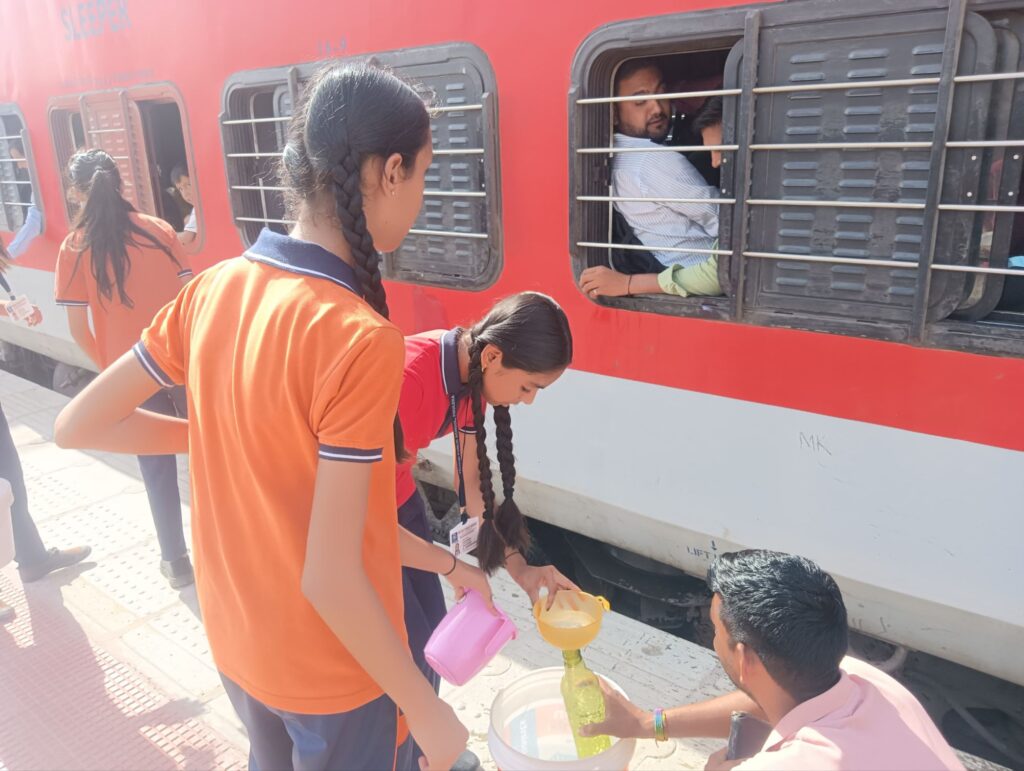 त्रिवेणी स्कूल के बच्चे और बच्चियां भी इस जल सेवा में शामिल हुए और अपने योगदान से यात्रियों को राहत पहुंचाई। श्री योगेंद्र जी गहलोत भी इस सेवा में सक्रिय रूप से शामिल रहे और अपना बहुमूल्य समय रेलवे स्टेशन फुलेरा पर निशुल्क जल सेवा में दिया।