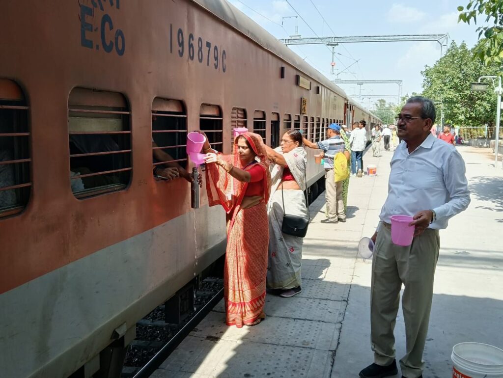 देनिक रेल यात्री महासंघ की ओर से यात्रियों को जलसेवा।