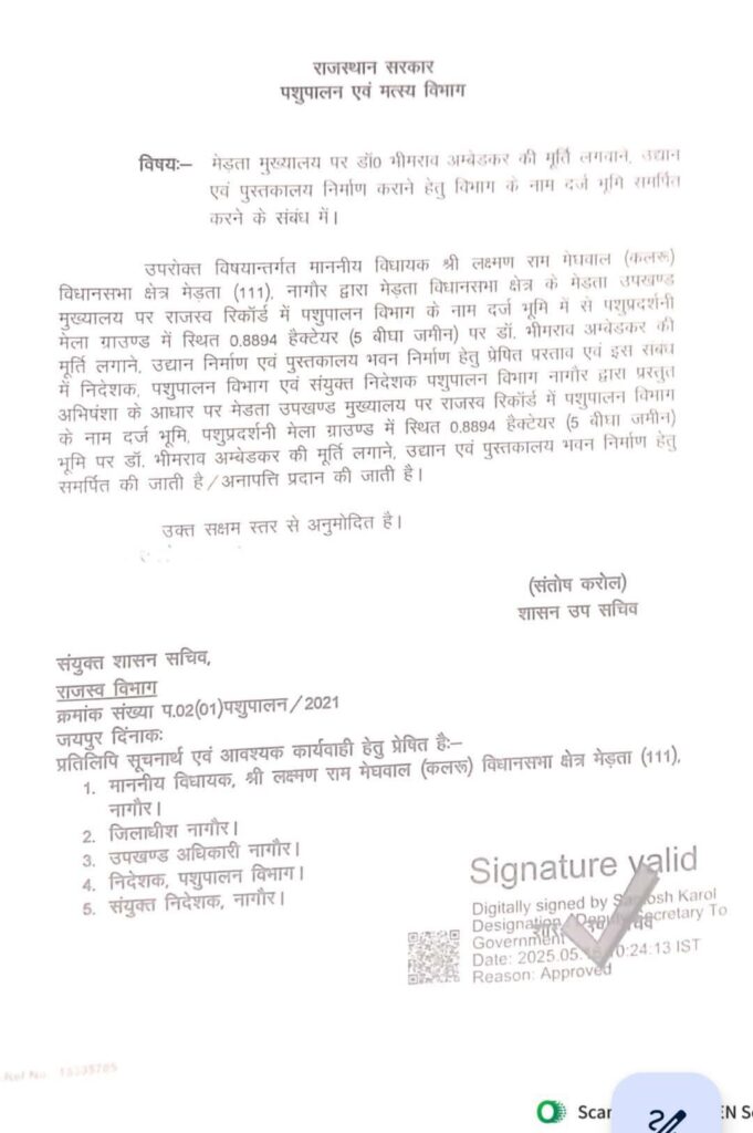 मेड़ता विधानसभा क्षेत्र के मेड़ता उपखंड मुख्यालय पर राजस्व रिकॉर्ड में पशुपालन विभाग के नाम दर्ज भूमि में से पशुप्रदर्शनी मेला ग्राउंड में स्थित 0.8894 हेक्टेयर भूमि पर डॉ. भीमराव अम्बेडकर की मूर्ति लगाने, उद्यान निर्माण और पुस्तकालय भवन निर्माण के लिए प्रस्ताव आया था। इस प्रस्ताव को निदेशक, पशुपालन विभाग और संयुक्त निदेशक पशुपालन विभाग नागौर ने अपनी अभिषंशा के साथ प्रस्तुत किया था।