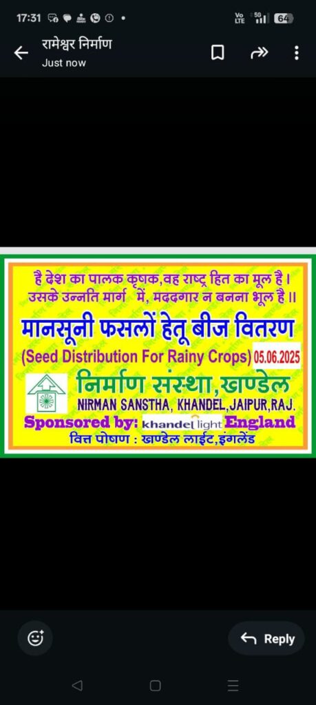 उसी निर्णय अनुसार जरूरतमंद 103 किसानों ने बीज लेने का आग्रह किया था। मानसूनी फसलों के लिए यह बीज वितरण का विशेष कार्यक्रम निर्माण संस्था खंडेल द्वारा बनाया गया है ।