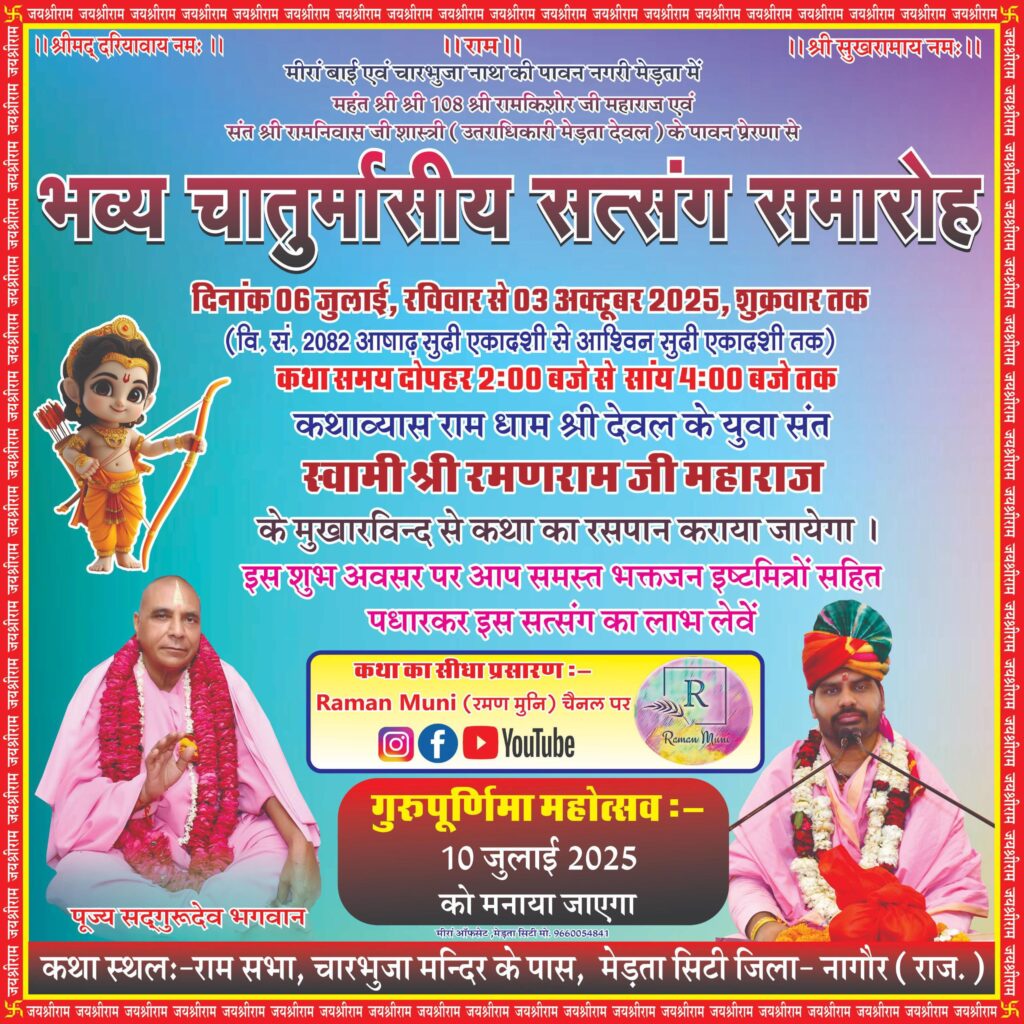 मीरां बाई एवं चारभुजा नाथ की पावन नगरी मेड़ता में महंत श्री श्री 108 श्री रामकिशोर जी महाराज एवं संत श्री रामनिवास जी शास्त्री (उतराधिकारी मेड़ता देवल) की प्रेरणा से भव्य चातुर्मासीय सत्संग समारोह का आयोजन किया जा रहा है। यह आयोजन 06 जुलाई, रविवार से 03 अक्टूबर, शुक्रवार तक (वि. सं. 2082 आषाढ़ सुदी एकादशी से आश्विन सुदी एकादशी तक) चलेगा। कथा प्रतिदिन दोपहर 2:00 बजे से सांय 4:00 बजे तक होगी, जिसमें राम धाम श्री देवल के युवा संत स्वामी श्री रमणराम जी महाराज कथा वाचन करेंगे।