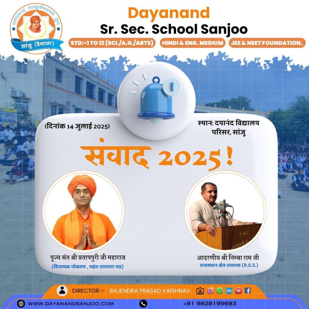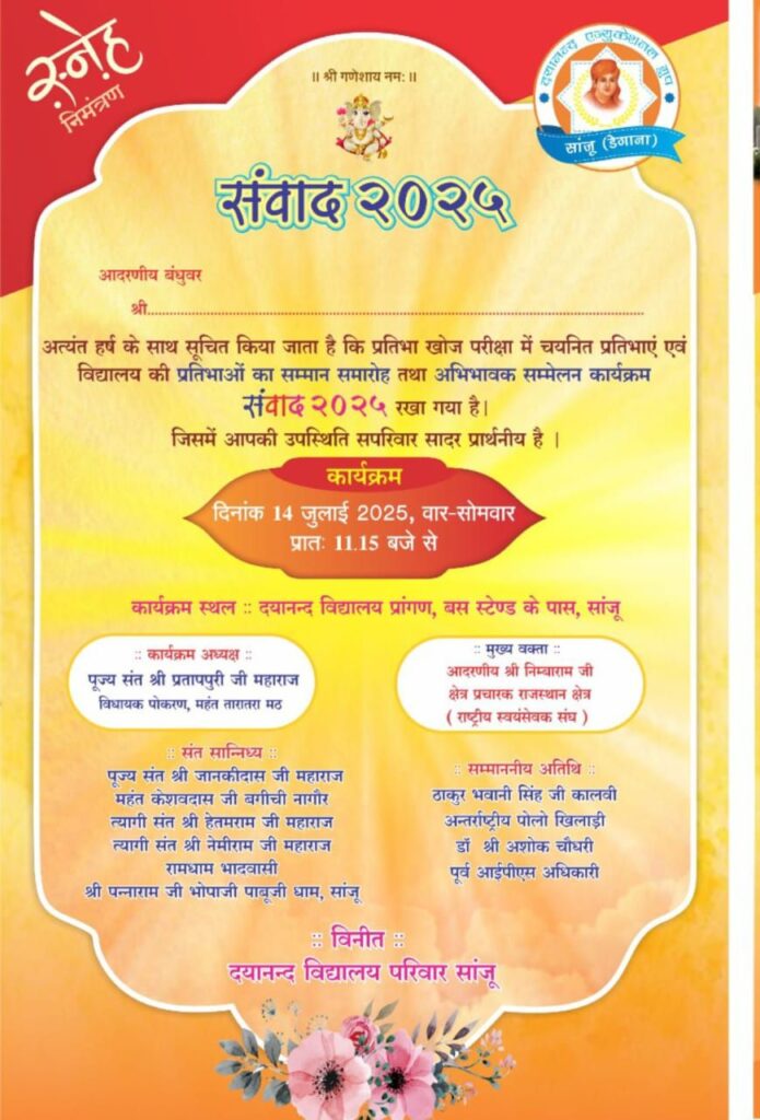 सांजू, 11 जुलाई। दयानन्द विद्यालय, सांजू में 14 जुलाई 2025 को एक महत्वपूर्ण कार्यक्रम आयोजित किया जा रहा है, जिसमें प्रतिभा खोज परीक्षा में चयनित प्रतिभाओं और विद्यालय की प्रतिभाओं का सम्मान समारोह तथा अभिभावक सम्मेलन रखा गया है। यह कार्यक्रम सोमवार, 14 जुलाई को प्रातः 11:15 बजे से दयानन्द विद्यालय प्रांगण, बस स्टेण्ड के पास, सांजू में होगा।