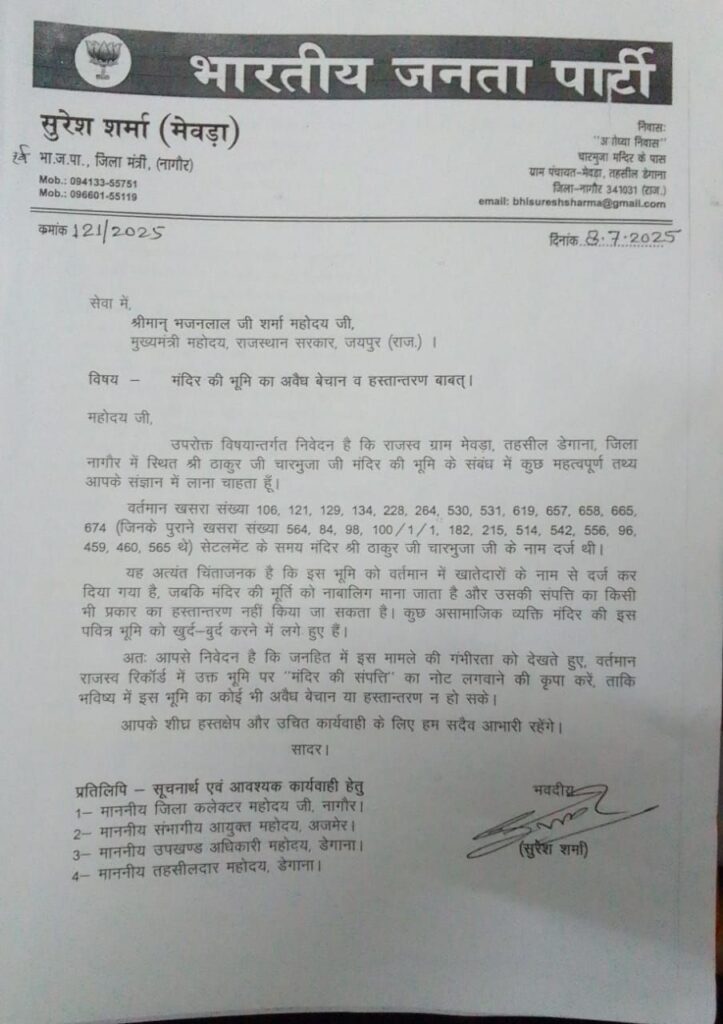 नागौर जिले के पंचायत समिति भेरूंदा के ग्राम पंचायत मेवड़ा में श्री ठाकुर जी चारभुजा डोली मंदिर की 23.91 हैक्टर यानी करीब 147 बीघा 5 – बिस्वा जमीन को लेकर विवाद त फिर गहरा गया है। यह जमीन पहले मंदिर के नाम दर्ज थी। अब यह खातेदारों के नाम हो गई है। भाजपा नेता सुरेश मेवड़ा ने मुख्यमंत्री भजनलाल शर्मा को ज्ञापन देकर आपत्ति जताई है। उन्होंने जमीन को फिर से मंदिर के एनाम दर्ज करने की मांग की है।