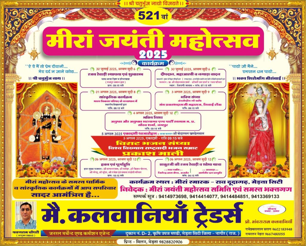 मेड़ता सिटी में भगवान श्री कृष्ण की अनन्य भक्त और सुप्रसिद्ध कवियत्री प्रथम पूज्या मीरा बाई का 523वां जन्मोत्सव उनकी जन्मस्थली और कर्म स्थली पर मनाया जाएगा। यह आयोजन प्रतिवर्ष होता है और इस वर्ष भी 7 दिनों तक अखंड हरिकीर्तन, खड़ी सप्ताह और अन्य धार्मिक कार्यक्रमों का आयोजन होगा।