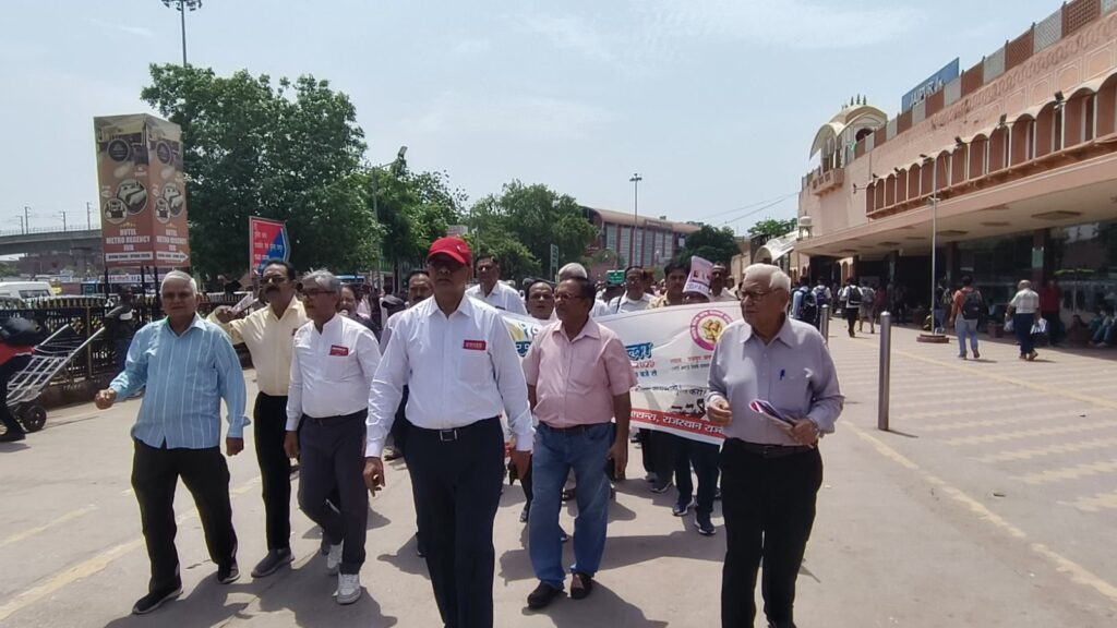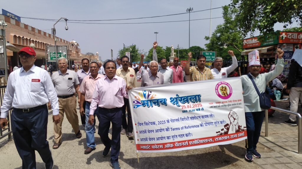 पेंशनर्स के संयुक्त मोर्चा की ओर से शुक्रवार को रेलवे स्टेशन परिसर पर आठवें वेतन आयोग के गठन किए जाने एवं पेंशनर को विभाजित करने वाले वित्त विधेयक (संशोधन) 2025 को वापिस लेने की मांगों के समर्थन में सैकड़ों पेंशनर ने मानव श्रृंखला बनाई। इससे पूर्व पेंशनर ने रैली निकाली।इस अवसर पर पेंशनर्स को श्रमिक नेता मुकेश माथुर, डी. के. छंगाणी, आर. के. सिंह, बी. एम. सुन्डा, एस. के. शर्मा ने संबोधित किया।