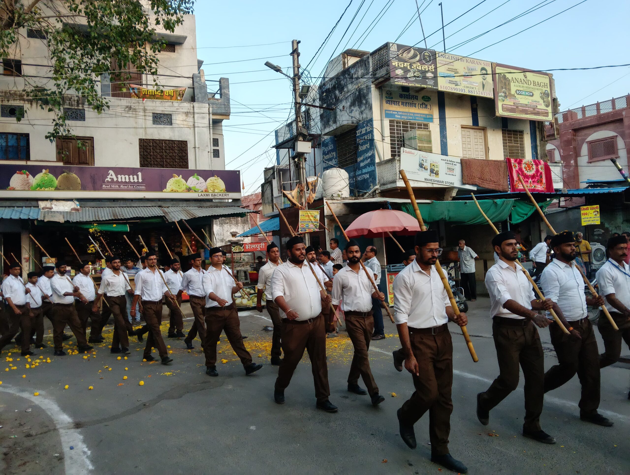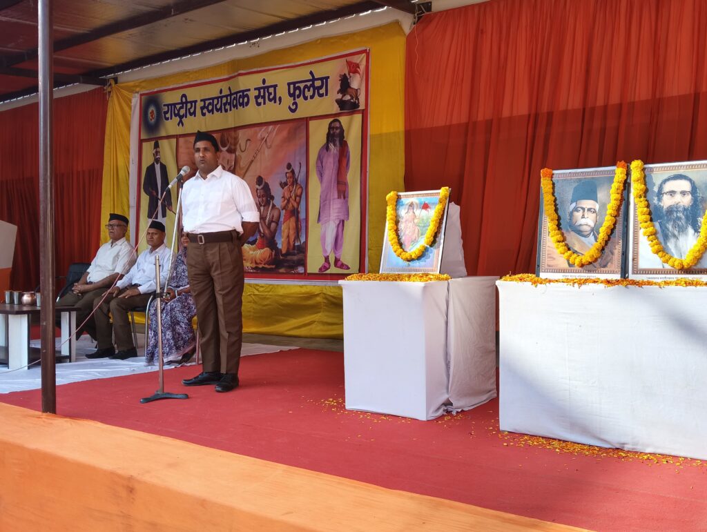 फुलेरा (दामोदर कुमावत) राष्ट्रीय स्वयं सेवक संघ(आरएसएस) के 100 वर्ष पूरे होने पर शताब्दी वर्ष के कार्यक्रम के तहत आदर्श विद्या मंदिर परिसर पर दोपहर तीन बजे से पथ संचलन व शस्त्र पूजन कार्यक्रम से पूर्व जयपुर प्रांत प्रचारक बाबूलाल ने उपस्थित राष्ट्रीय स्वयंसेवकों को आरएसएस के बारे में विस्तार से बताते हुए देश की आजादी से पूर्व आरएसएस की देश के प्रति किए गए