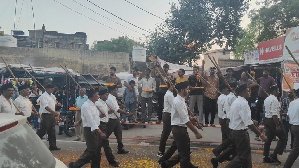 आरएसएस के पथ संचलन पर बजरंग दल ने की भव्य पुष्पवर्षा,