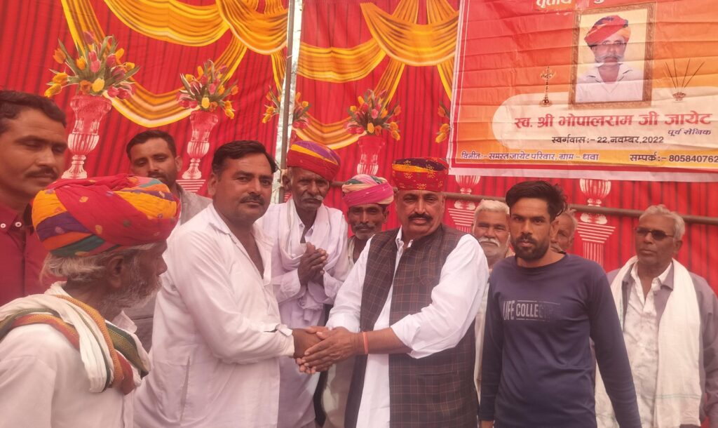 रूण-पंचायत समिति मूंडवा के गांव धवा में शनिवार को पूर्व सैनिक की पुण्यतिथि के अवसर पर हुए समारोह में विधायक डांगा ने कहा कि विधानसभा चुनाव में यहां की जनता ने तन मन धन से मुझे जीत का सहारा पहनाया उसके लिए आपका हम आभार जताते हैं, गांव के विकास में हम सदा आगे नजर आएंगे, वहीं डांगा ने पूर्व सैनिक भोपाल राम जायट की प्रतिमा पर पुष्प अर्पित करते हुए श्रद्धांजलि दी।