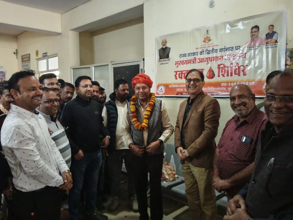 फुलेरा(दामोदर कुमावत) फुलेरा में आज मुख्यमंत्री  भजन लाल शर्मा के कुशल नेतृत्व में राज्य सरकार के 2 वर्ष पूर्ण होने के उपलक्ष में उप जिला अस्पताल में मुख्यमंत्री आयुष्मान आरोग्य रक्तदान शिविर का आयोजन किया गया।इस अवसर पर फुलेरा पूर्व विधायक एवं भाजपा राष्ट्रीय परिषद सदस्य  निर्मल  कुमावत ने उप जिला अस्पताल पहुंचकर रक्तदान करने वाले युवा साथियों एवं मातृ शक्ति का उत्साह वर्धन किया तथा उपस्थित अन्य युवाओं को भी रक्तदान हेतु प्रेरित किया।