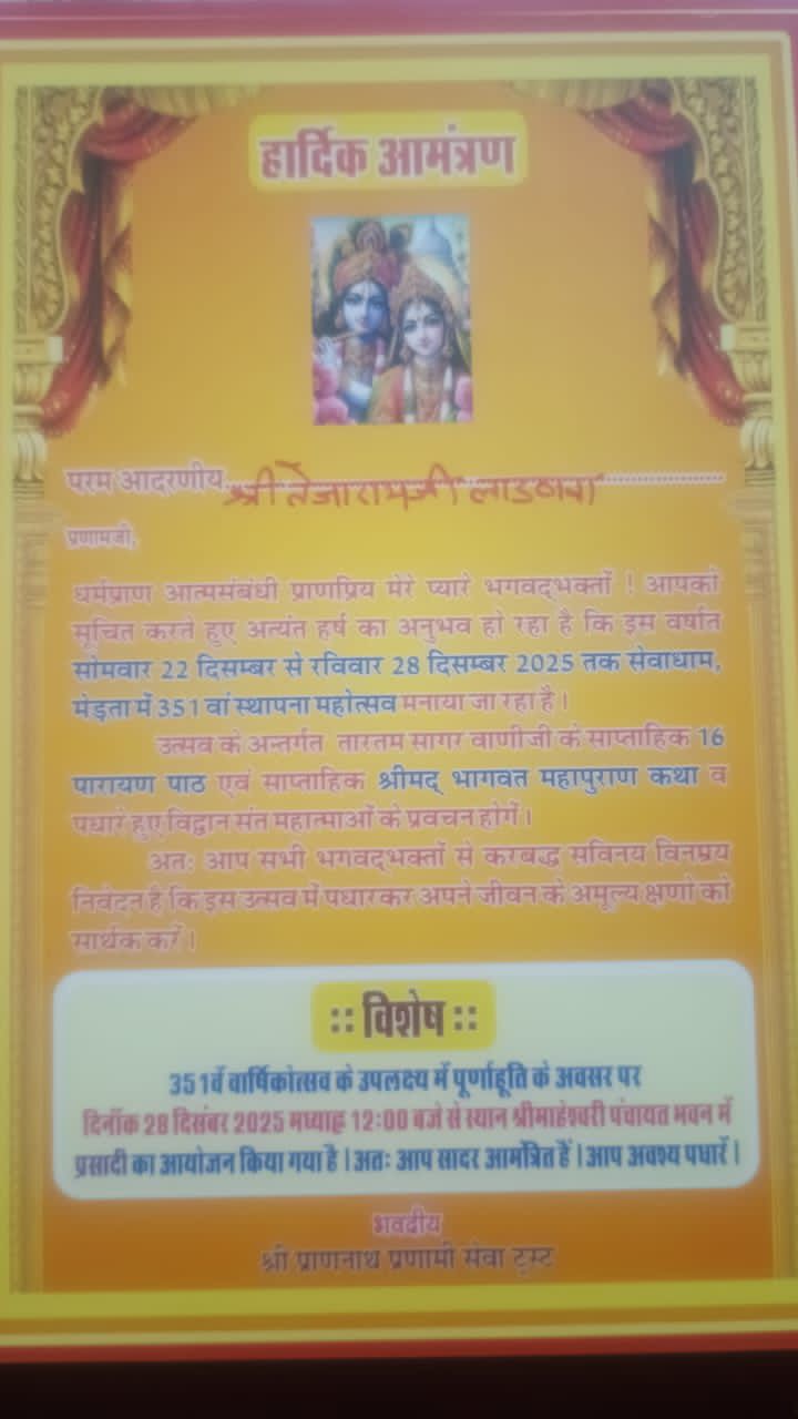 इस पावन अवसर पर देशभर से सुंदरसाथ एवं श्रद्धालु मेड़ता पहुंचेंगे। महोत्सव की पूर्णाहुति 28 दिसंबर को दोपहर में संपन्न होगी।