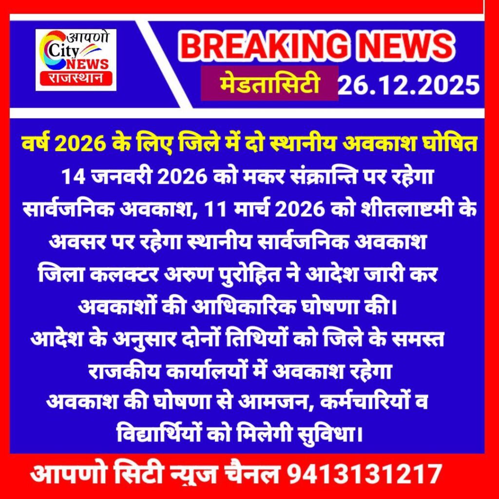 वर्ष 2026 के लिए जिले में दो स्थानीय अवकाश घोषित 14 जनवरी 2026 को मकर संक्रान्ति पर रहेगा सार्वजनिक अवकाश, 11 मार्च 2026 को शीतलाष्टमी के अवसर पर रहेगा स्थानीय सार्वजनिक अवकाश जिला कलक्टर अरुण पुरोहित ने आदेश जारी कर अवकाशों की आधिकारिक घोषणा की। आदेश के अनुसार दोनों तिथियों को जिले के समस्त राजकीय कार्यालयों में अवकाश रहेगा अवकाश की घोषणा से आमजन, कर्मचारियों व विद्यार्थियों को मिलेगी सुविधा।
